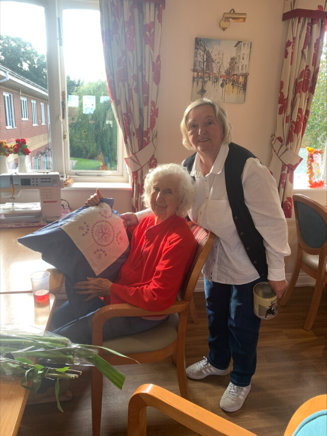 In her first visit, Elenore created a lovely cushion, which was later raffled as a prize. A delighted resident won the cushion and now takes it everywhere, even bringing it to the dining table at mealtimes, a testament to how meaningful Elenore’s gifts have become.